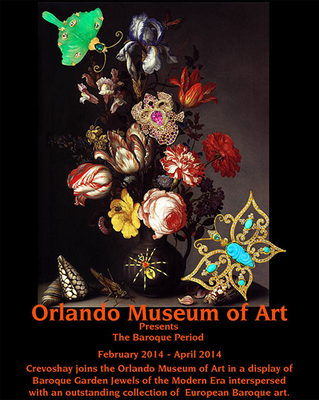 Later this month, visitors to the Orlando Museum of Art will have their own chance to experience a Crevoshay conjunction, on a scaled-down scale. As part of the museum’s 90th anniversary celebration, about fifteen Crevoshay nature-themed creations will be displayed, their backdrop being the floral still-life paintings from the seventeenth century’s Golden Age of Painting. The display is part of an exhibition that runs through May 25: Rembrandt, Rubens, Gainsborough and the Golden Age of Painting in Europe from the Speed Art Museum, Louisville, Kentucky.